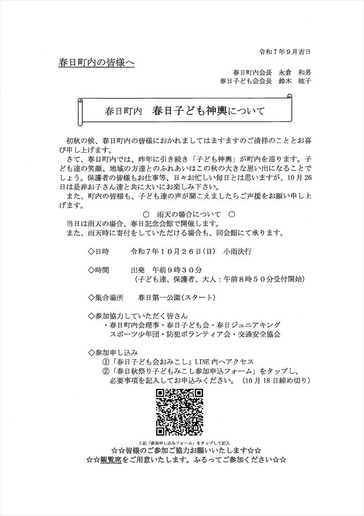 詳しくは、「子どものページ」→「春日子ども会」を参照してください。
