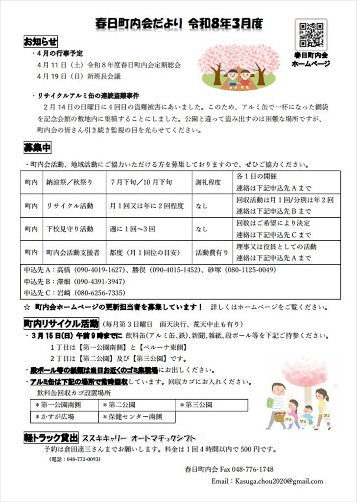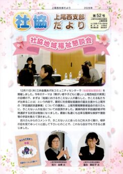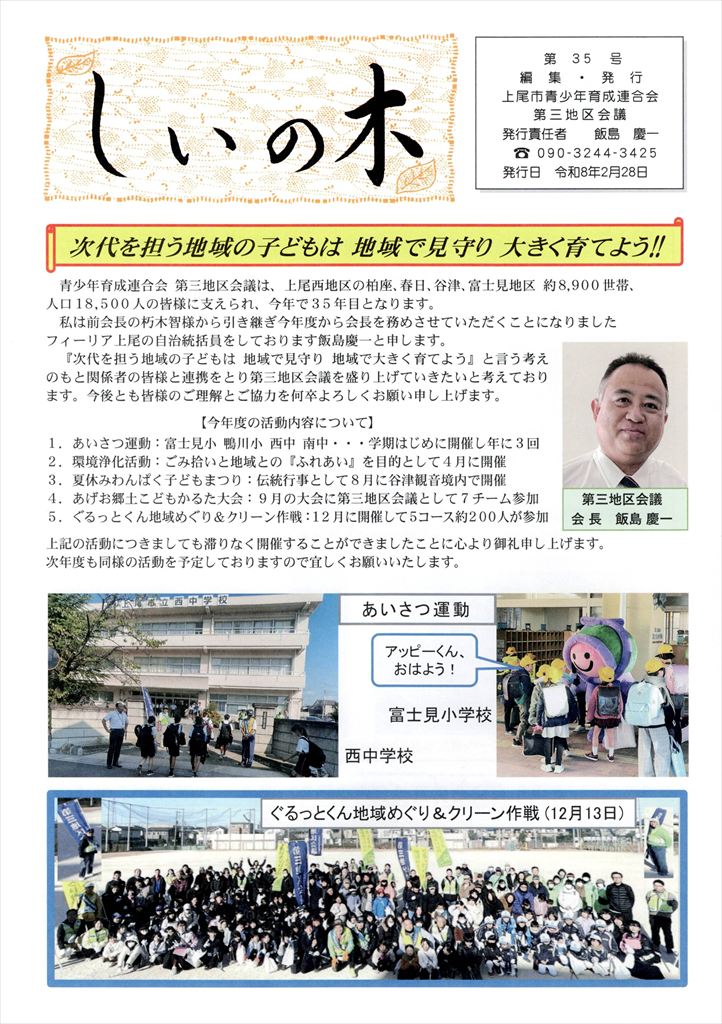 上尾市青少年育成連合会、社会福祉協議会からの活動報告 上尾市青少年育成連合会 第三地区会議 および 社協 上尾西支部 から令和7年度活動報告の広報誌が発行されました。全戸配布されましたので、表紙のみ掲示します。