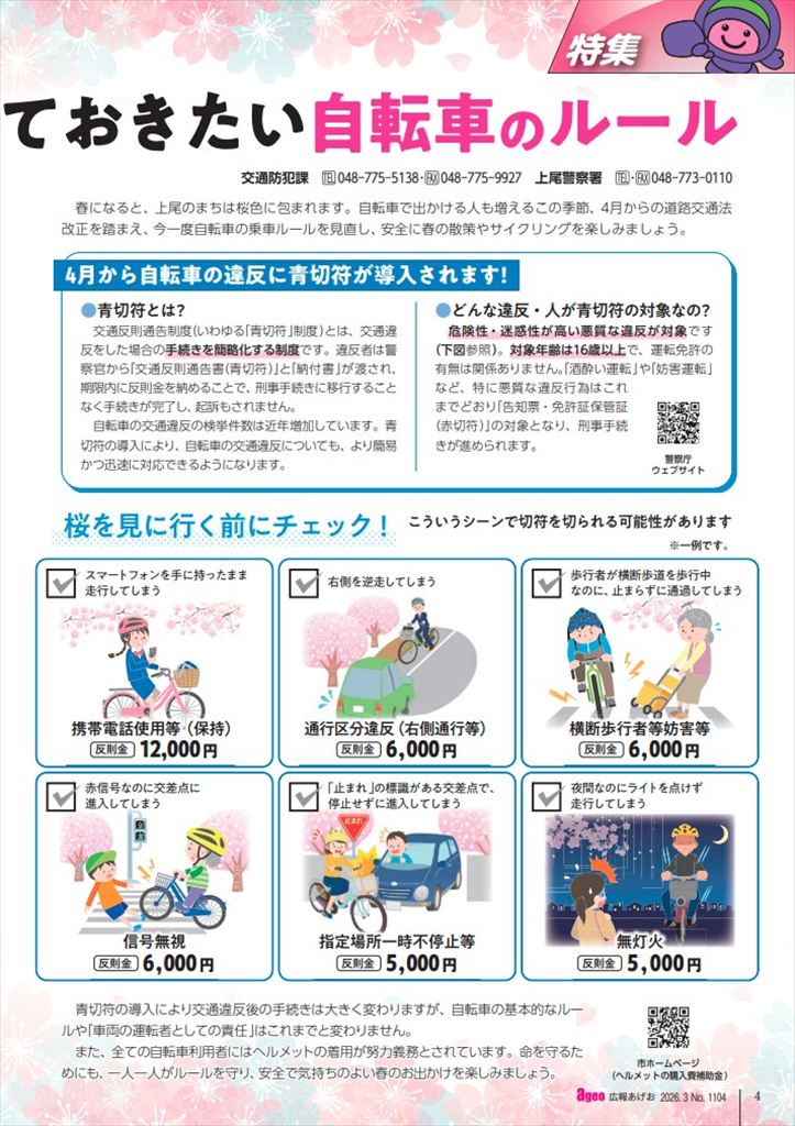 ★新★自転車のルール(令和8年4月1日施行) 令和8年4月1日から、自転車の違反に青切符(交通反則通告制度)が導入されます! 取り締まりの対象年齢は 16歳以上です。 (回覧は不許複製となっていますので、広報あげお 令和8年3月号の記事を載せます)