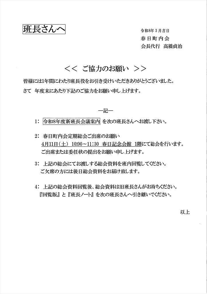 現班長さんは、4月11日(土)の総会と総会資料の回覧が最後のお仕事になります。その後、「回覧板ホルダー」と「班長ノート」を新班長さんに引き継いでください。
