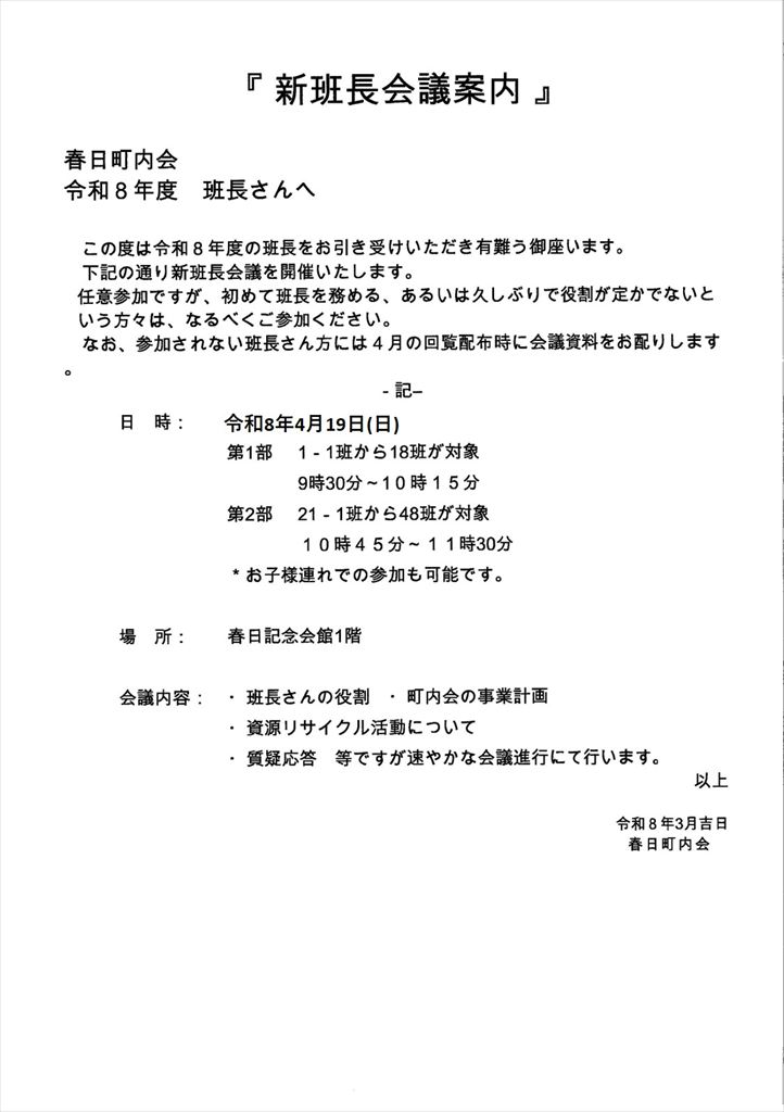 新班長さんは、4月19日(日)に新班長会議があります。初めての班長、あるいは久しぶりの班長で、役割が定かでない班長さんは是非ご参加ください(任意参加)。