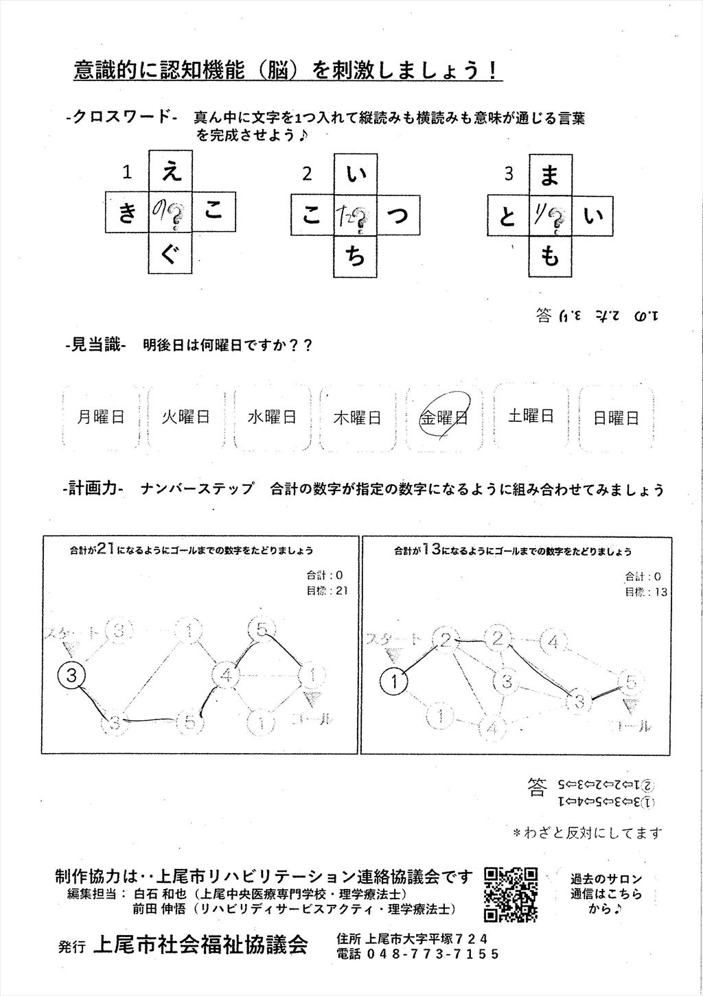 ①社協提供の漢字クイズなど ことわざ・慣用句・金がつく熟語など。その前に認知機能のチェックです。「明後日は何曜日ですか?」